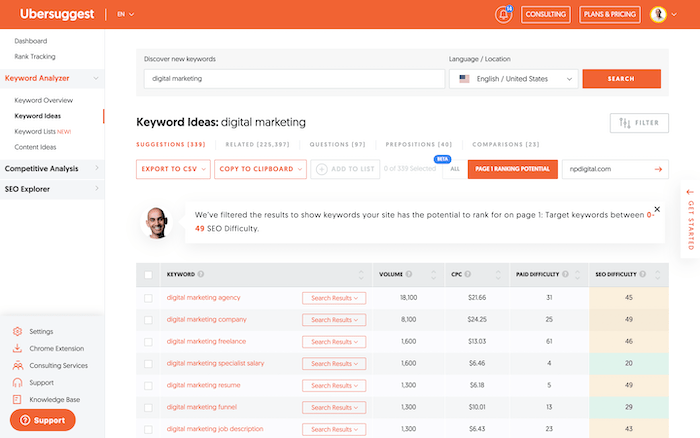 And to help you find those keywords we released a new Ubersuggest feature that will show you a list of keywords that are perfect for your site in less than 60 seconds.